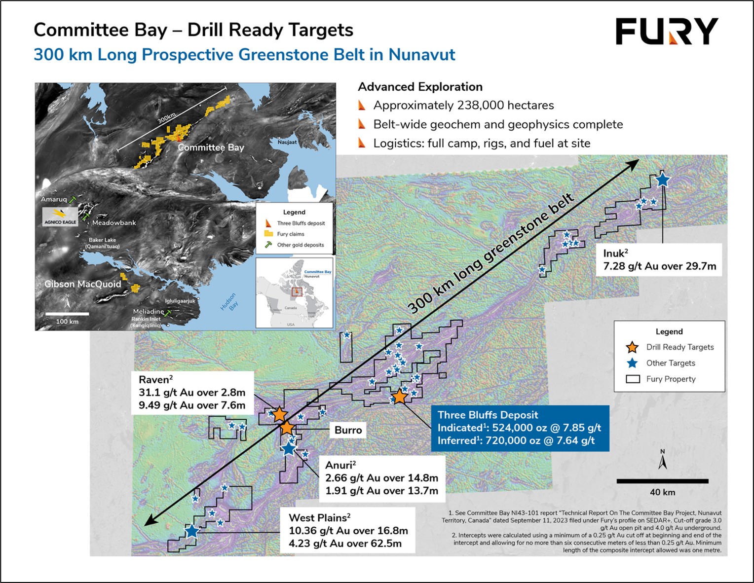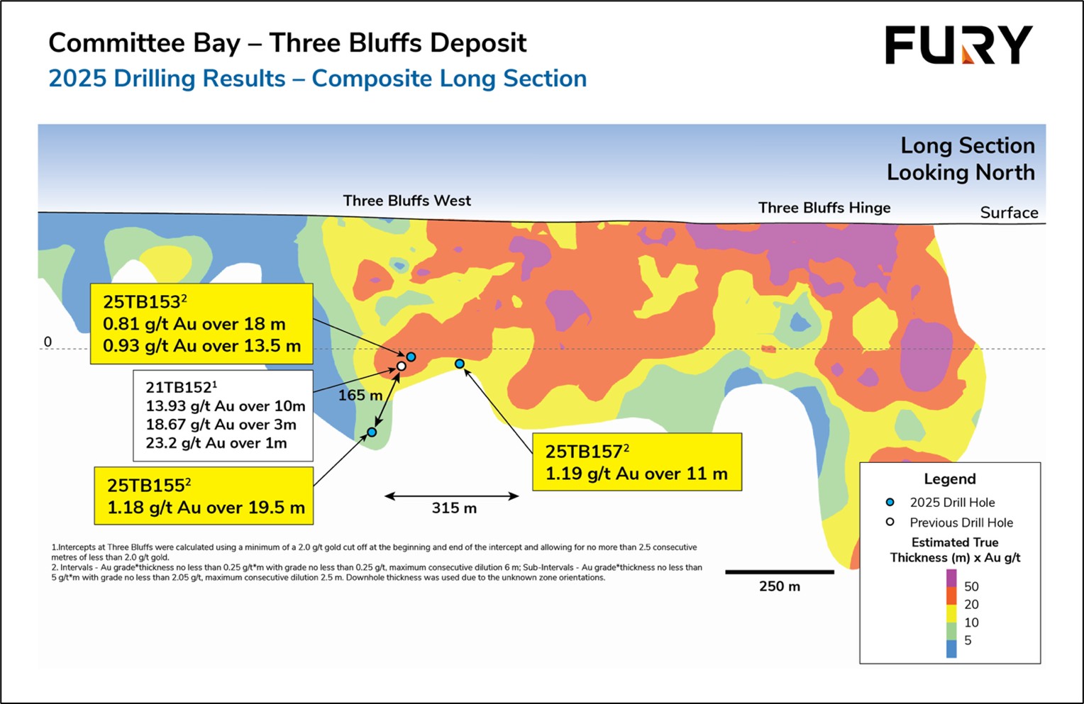 TORONTO, Canada – November 10, 2025 – Fury Gold Mines Limited (TSX and NYSE American: FURY) (“Fury” or the “Company”) announces the results from the 2025 exploration drilling program at the Committee Bay project, located in the eastern Kitikmeot region of Nunavut, Canada (Figure 1). The 2025 drilling program comprised six (6) diamond drill holes totaling approximately 2,778 metres (m). Four of the drill holes (2,041m), targeting expansion of the Three Bluffs Shear Zone intercepted gold mineralization across 315m of strike with mineralized widths of up to 19.5m, including 5.73 grams per tonne (g/t) gold across 3.0m within a broader interval of 1.18 g/t gold over 19.5m (Hole 25TB155), which ended in the mineralized zone (Table 1; Figure 2).
