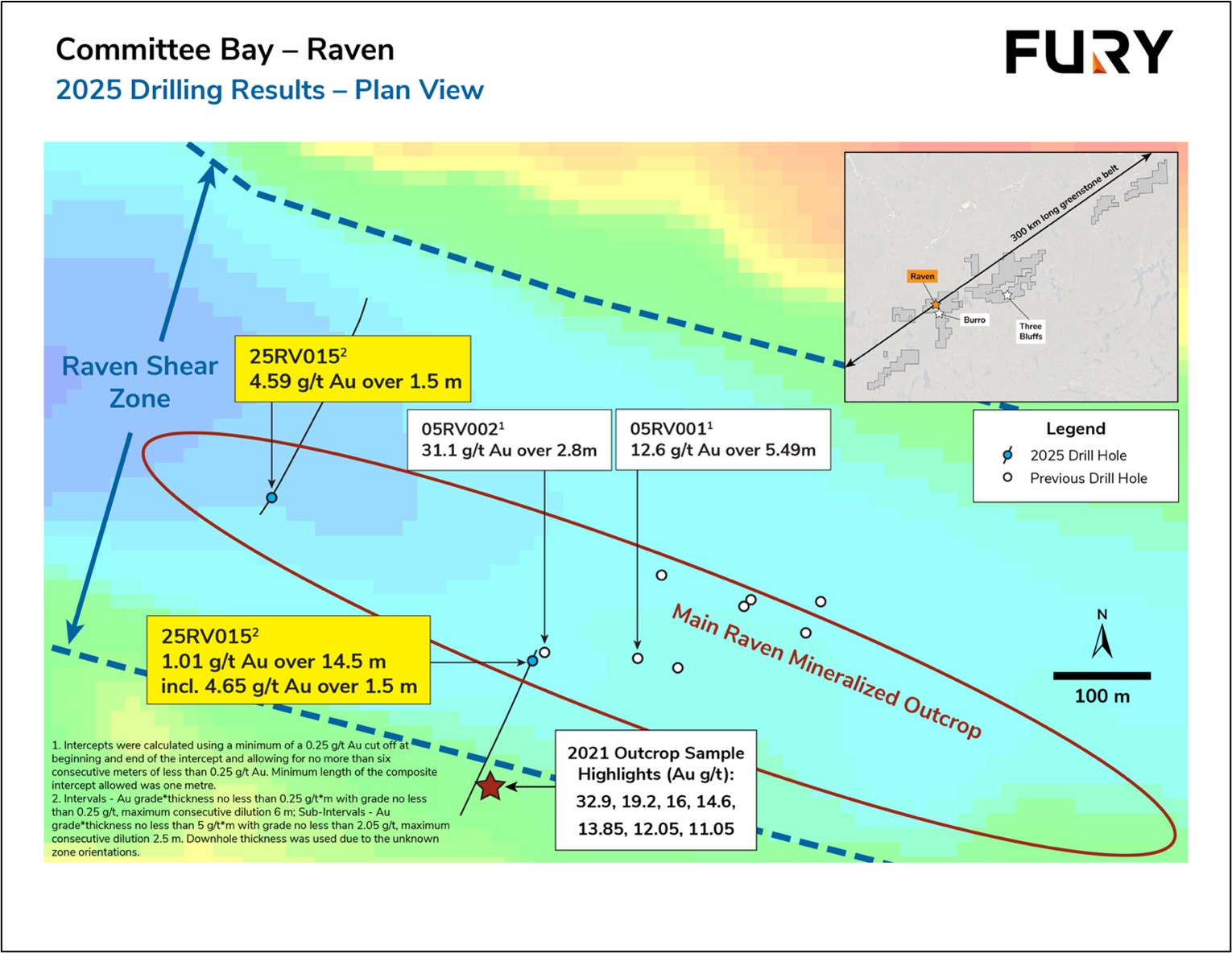 “Our 2025 exploration drilling in Nunavut successfully extended mineralization at Three Bluffs and validated the Raven Target. We are encouraged by the results encountered this year and believe that there is good potential to further expand the known gold zones at Committee Bay, which the Company will be evaluating with the aim of planning a future work program,” commented Tim Clark, CEO of Fury.
